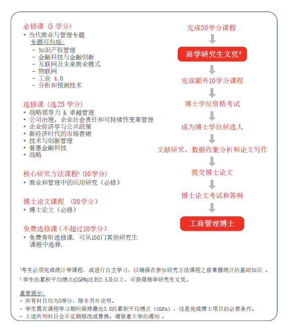 完成30学分项目后,学生将被授予商学研究生文凭。完成额外10学分项目后,学生需要通过博士资格考试(Qualifying Examination) 以获得博士学位候选人资格 (DBA Candidacy)。