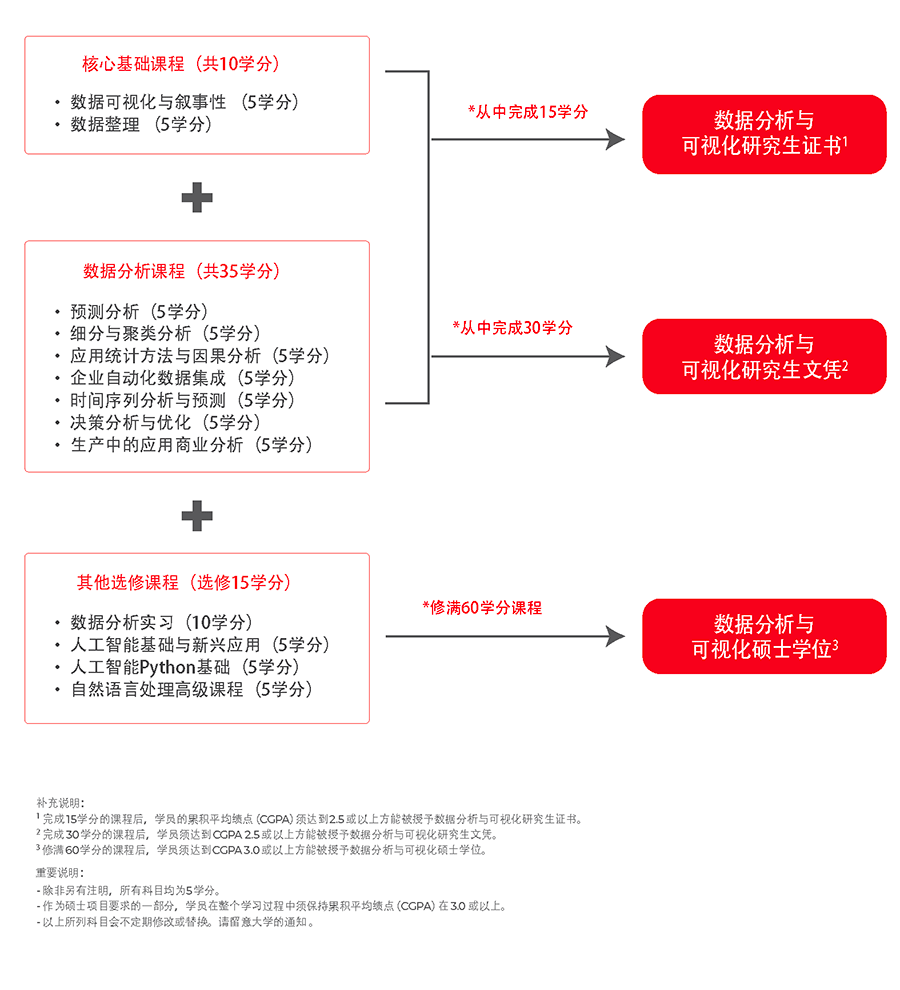 课程采用学分制,成功修满60个学分,累计平均绩点(CGPA)最少达到3.0,可获得新加坡社科大学颁发的数据分析与可视化硕士学位。在修读过程中,达到一定学分和要求的学生将获得数据分析与可视化研究生证书和数据分析与可视化研究生文凭。