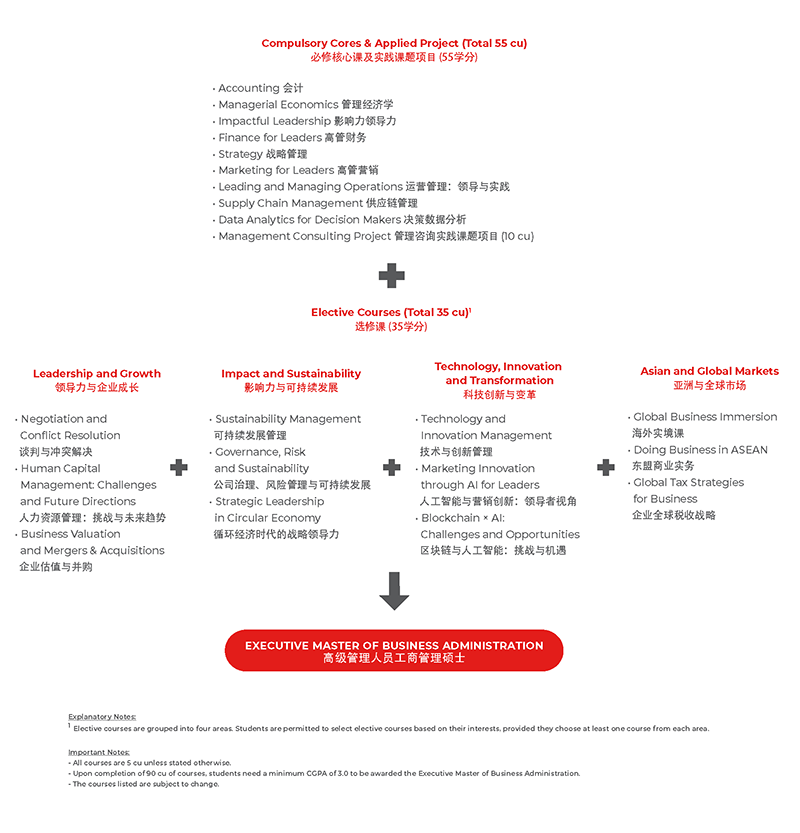 项目的标准学制为2年,最短1.5年,最长4年。为了达到毕业要求,学生必须完成90学分,包括九门涵盖核心管理知识的必修课(45学分);七门涉及前沿主题的选修课(35学分);以及一项必修的实践课题项目(10学分)。