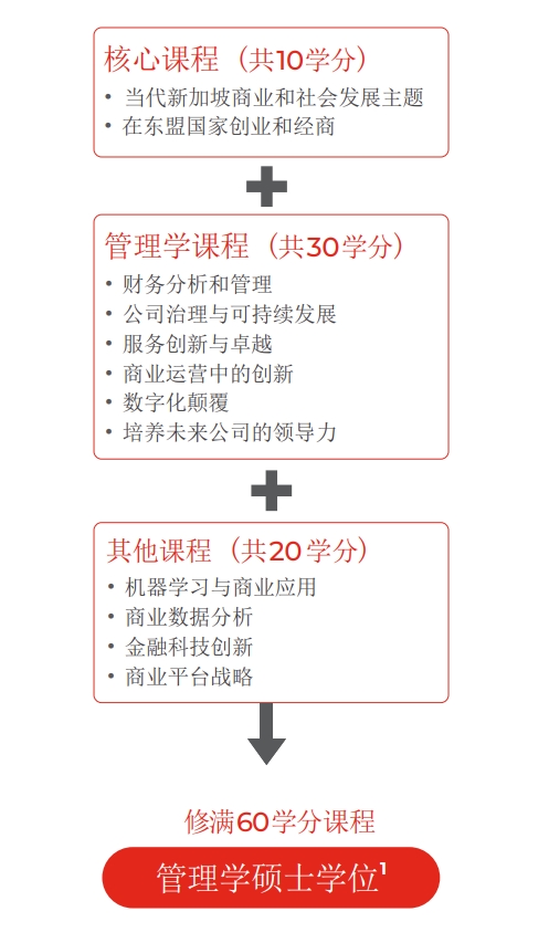 中文管理学硕士项目(Master of Science in Management) 使用中文授课,考试也使用中文。该项目为学生在管理学各领域奠定扎实的理论基础,提升管理理念和能力,了解最新的科技应用和商业模式,探索新加坡和东盟地区的经济商业机会和挑战。通过本项目学习,学生将获得全方位的商业决策和组织管理能力的提高。