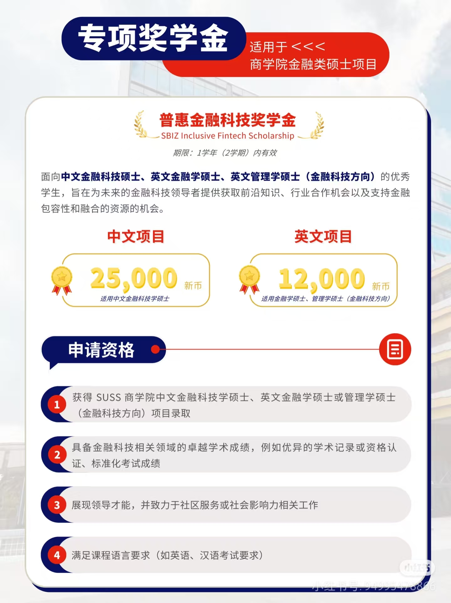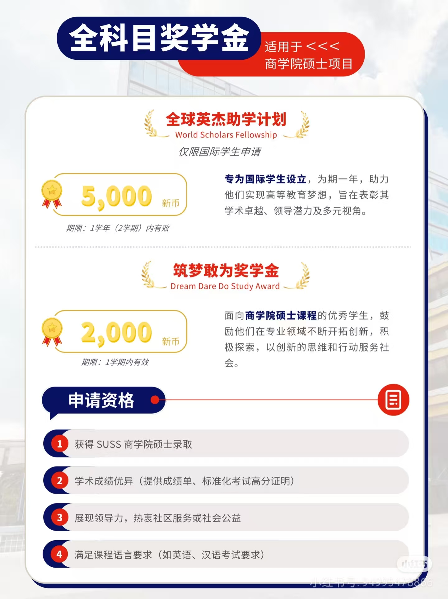 为鼓励更多优秀的国际留学生来SUSS深造,我们推出了全球英杰助学计划(World ScholarsFellowship)、“筑梦敢为奖学金”(Dream DareDo Study Award)以及面向金融类硕士项目的普惠金融科技奖学金(SBlZInclusive Fintech Scholarship)等具有吸引力的奖学金,助力学生圆梦狮城~
